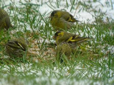 These days there is much activity in the feeders, with a flock of Siskin of 110 birds, eating seeds in the ground, underneath the feeders, some birds also eating directly of them.