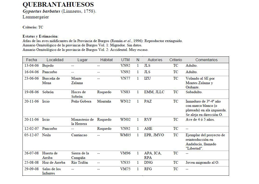 In the province of Burgos the last Lammergeier that bred was in 1956 La Yecla and Ortigüela, Pancorbo in 1954 and Arlanza valley in 1976. (Gonzalez, D., Román, F, Fernandez, R., Lobo, J.L. 2006 Anuario Ornitológico de la provincia de Burgos. Vol.1)